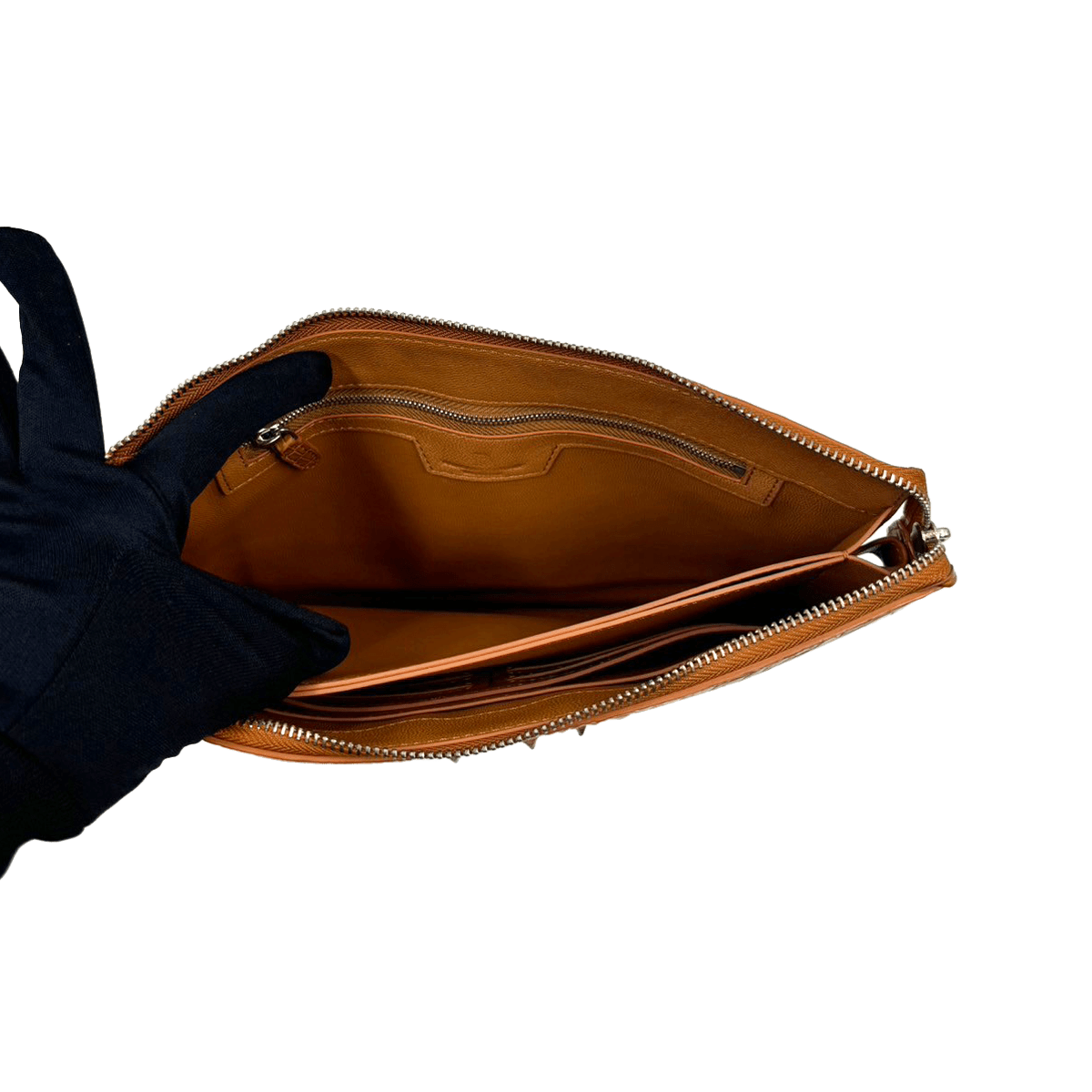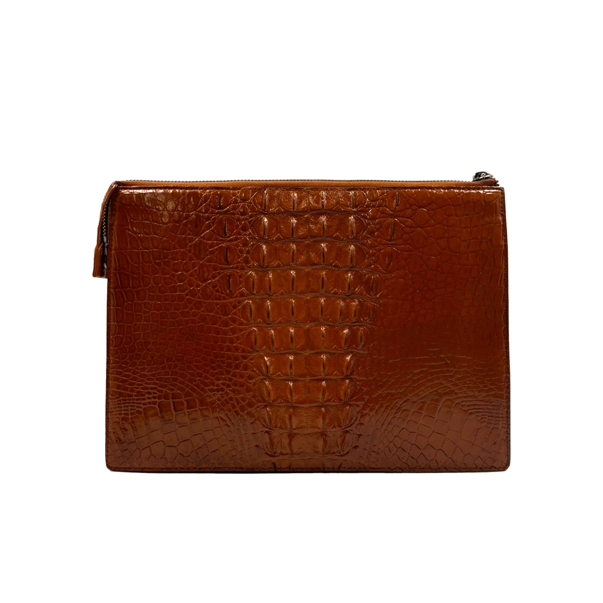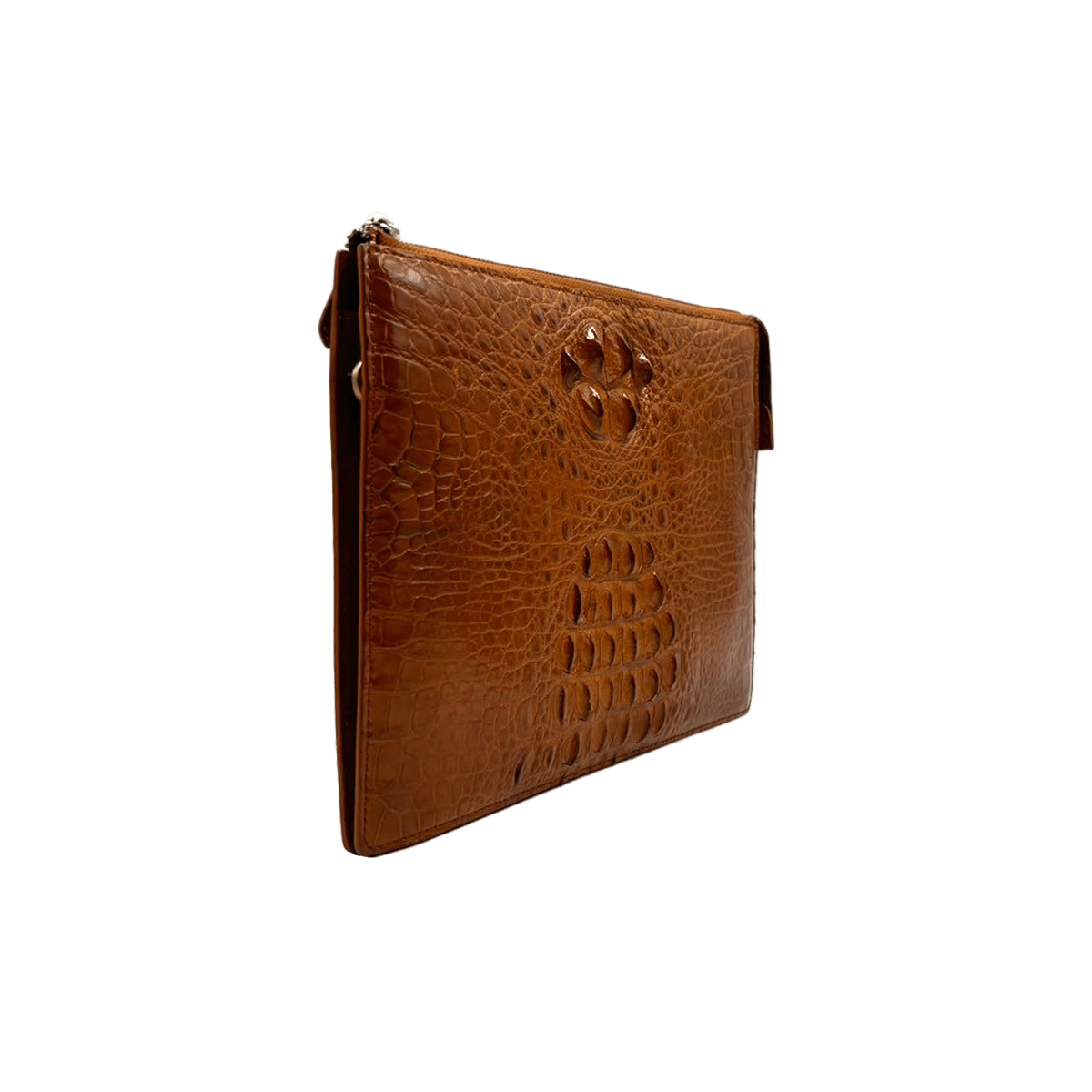 Baldur is a clutch bag for business made from genuine crocodile hornback leather that makes it look professional and reliable for long-term use. This functional business bag, in size 29cm, is a top large zip big size exotic bag with a long wristlet crafted from quality genuine crocodile hornback skin. To carry your personal documents, A4 papers, passport, cards, cell-phone, pen, keys like a pochette into a business meeting when dealing with important companies use Bangkok Bootery exotic leather document bag and stay nice and well-organized. Exterior material is 100% real crocodile hornback skin that is rough and natural and interior material is genuine soft calf leather. The main features of this practical document bag are 3 main spacious center compartments, a large inner zipper pocket, 2 pouch pockets, 6 twin style card slots to hold your national ID card, driving license, and back cards.