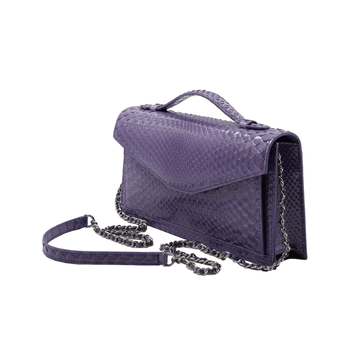 CERVIN WITH HANDEL a luxury clutch bag designed by Bangkok Bootery expert craftsman who are No.1 in Thailand. Cervin with handle is a medium big size exotic clutch bag with chain leather strap designed by Bangkok Bootery and handcrafted from start to finish. Cervin in size 25cm is Bangkok Bootery’s best selling sling bags crafted from genuine python back skin in shiny limited tone of color. An envelope shape design that looks chic and luxury highlighted by a top handle and flap over.