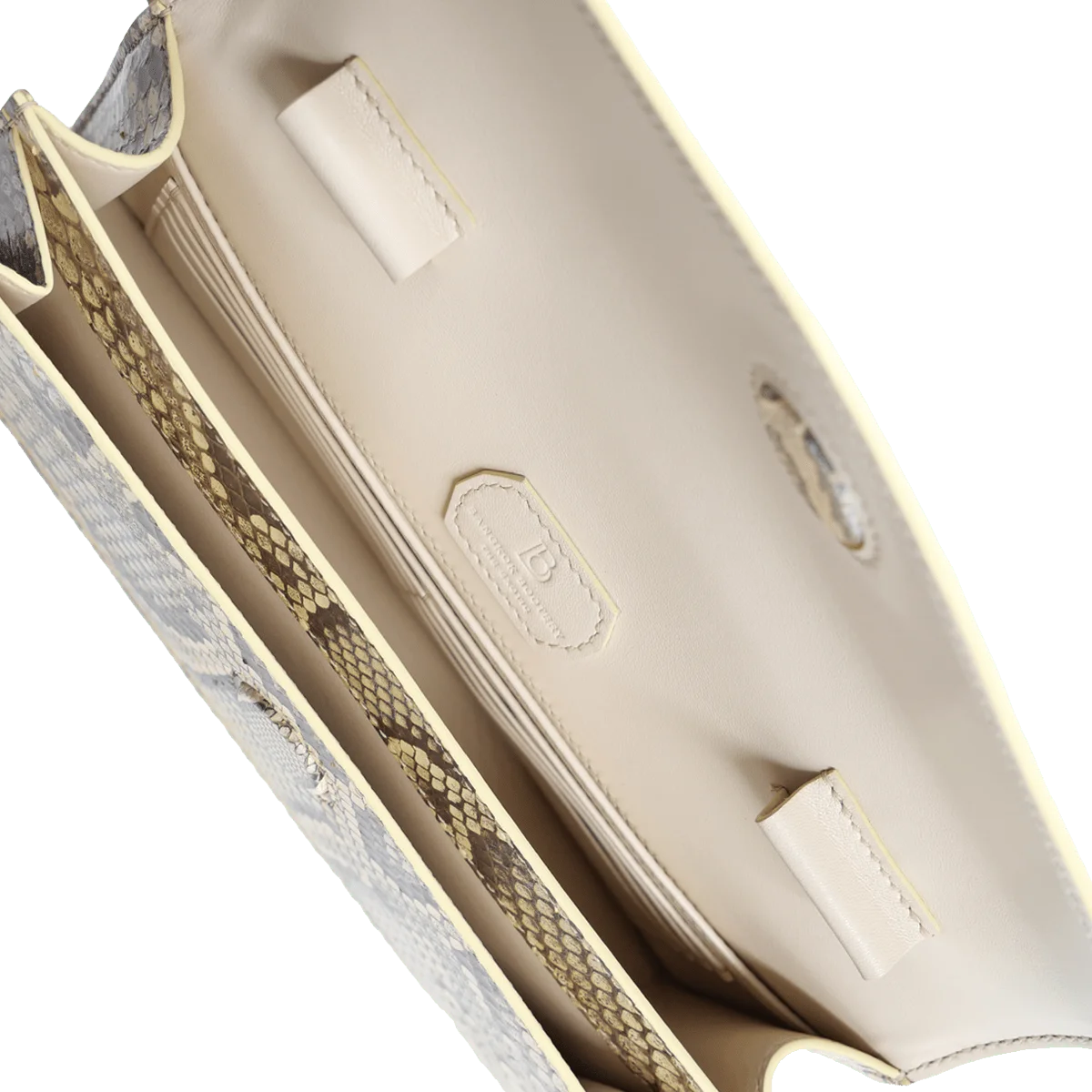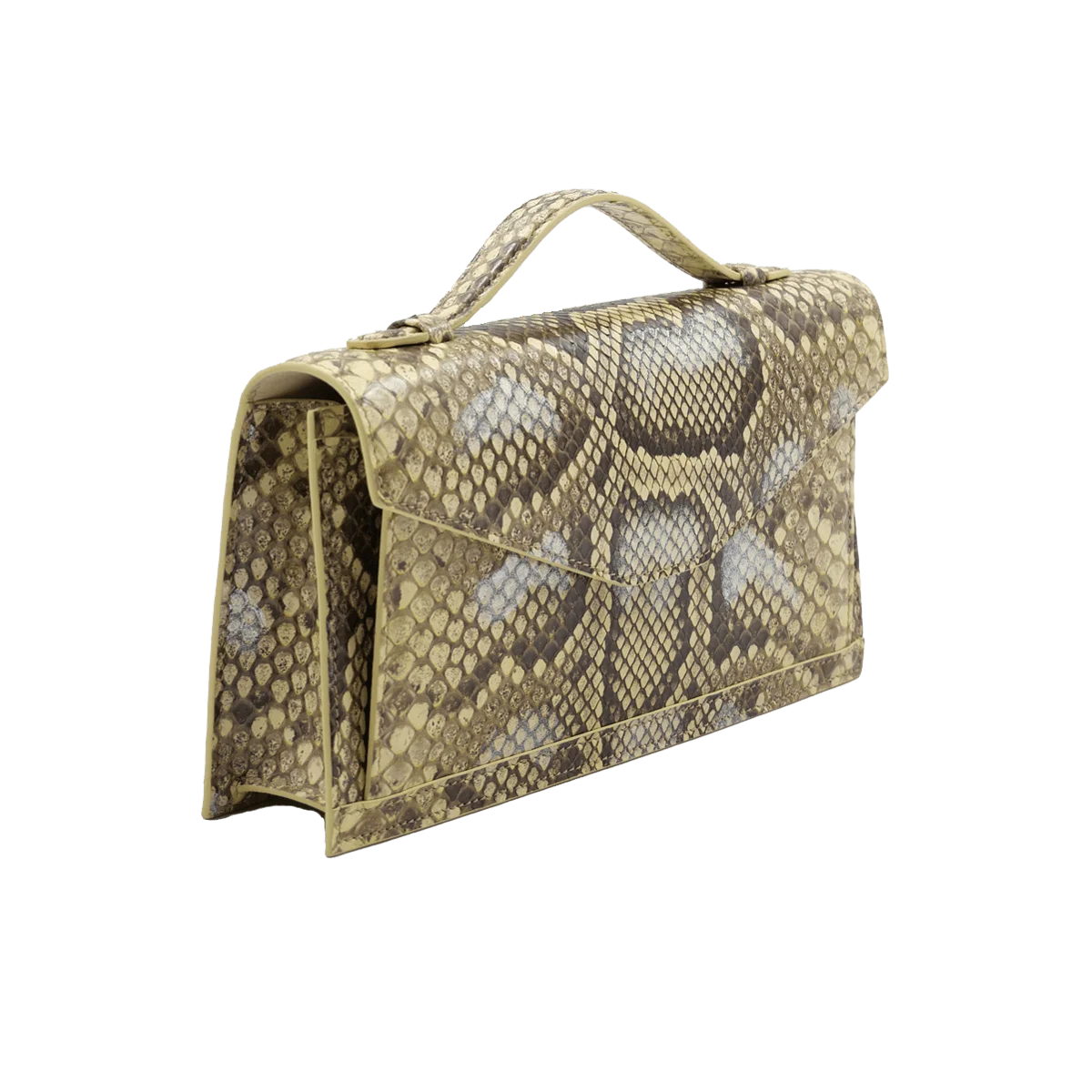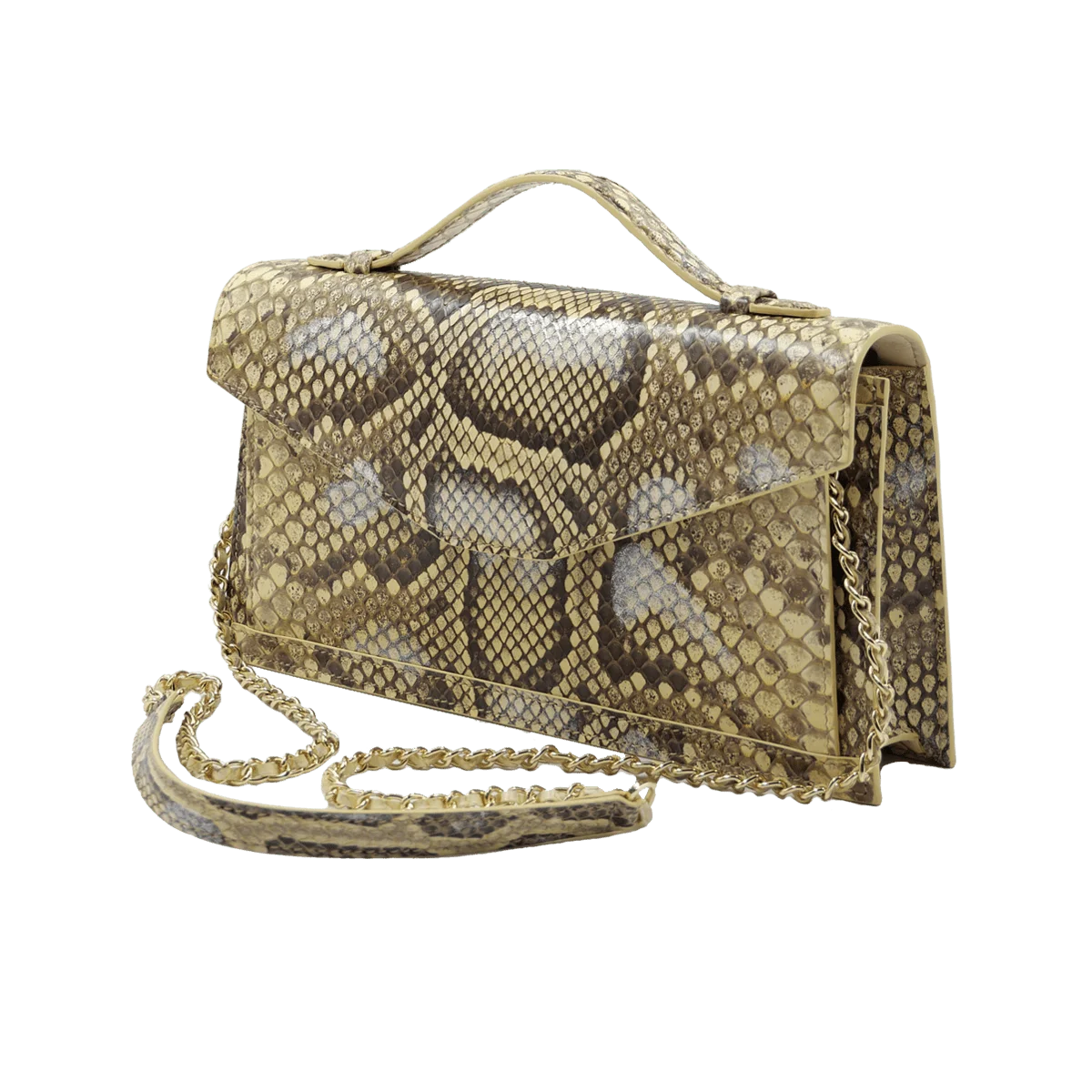 CERVIN WITH HANDEL a luxury clutch bag designed by Bangkok Bootery expert craftsman who are No.1 in Thailand. Cervin with handle is a medium big size exotic clutch bag with chain leather strap designed by Bangkok Bootery and handcrafted from start to finish. Cervin in size 25cm is Bangkok Bootery’s best selling sling bags crafted from genuine python back skin in shiny limited tone of color. An envelope shape design that looks chic and luxury highlighted by a top handle and flap over.