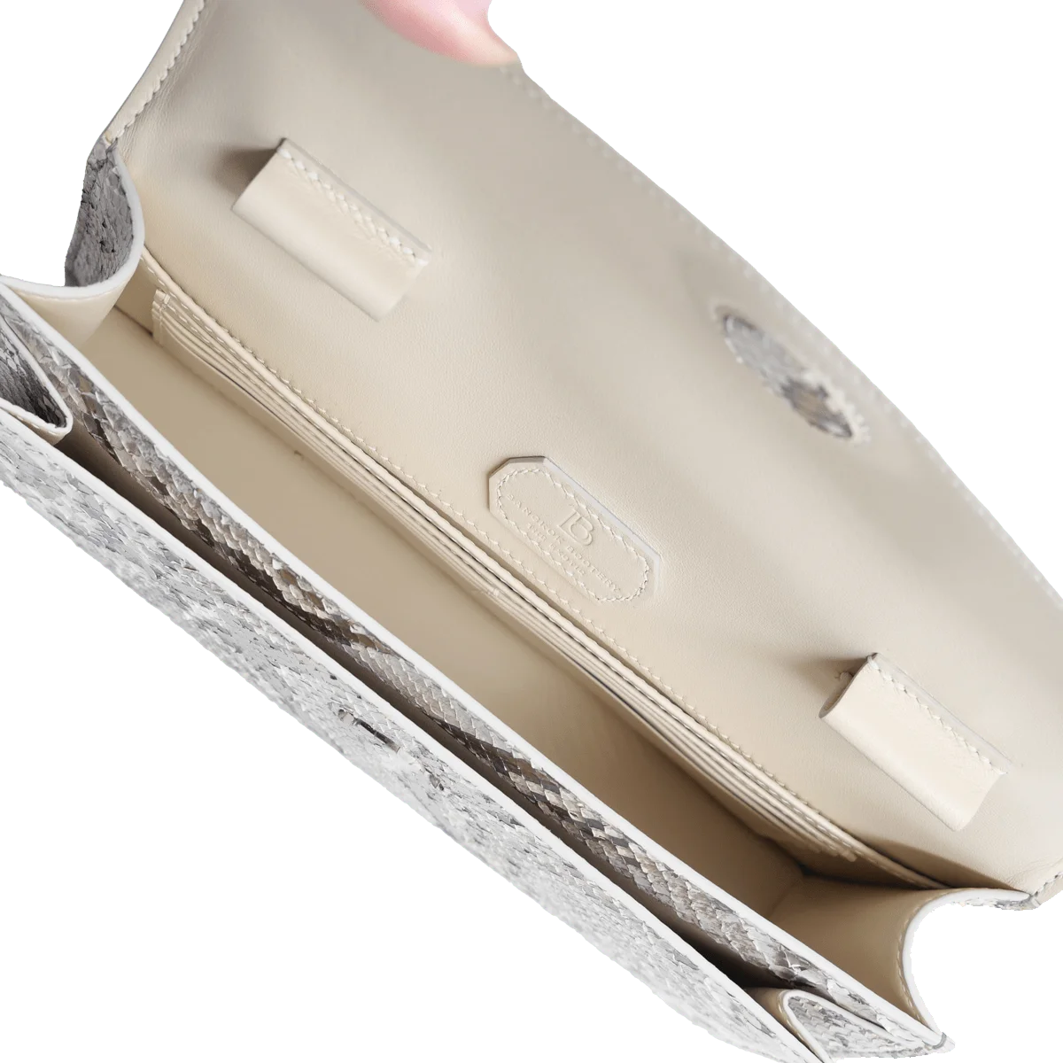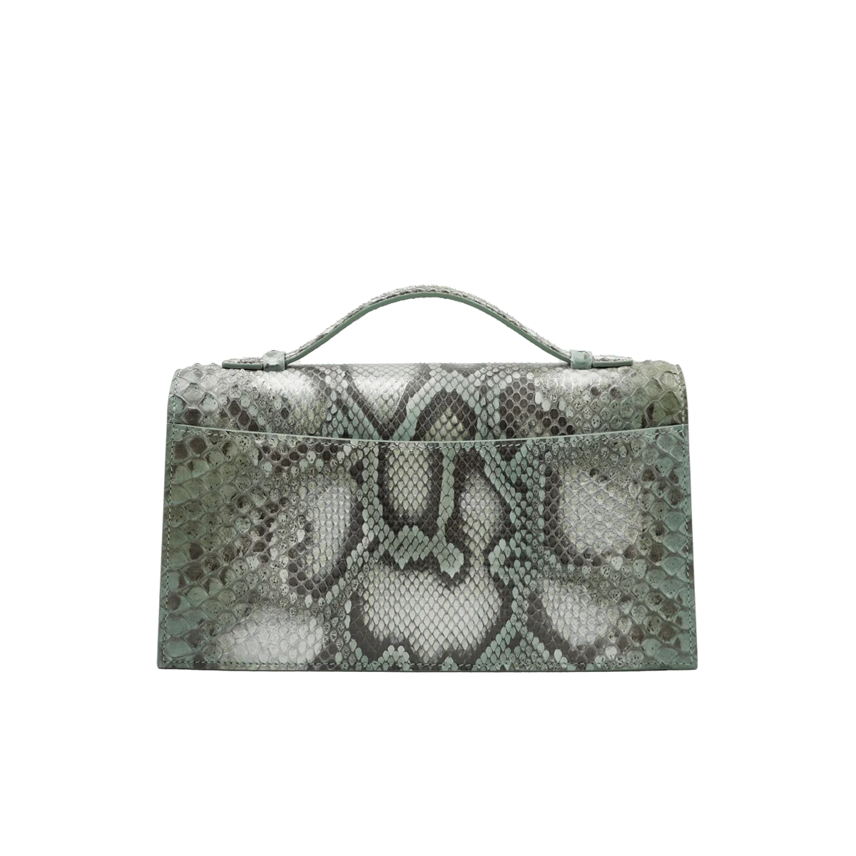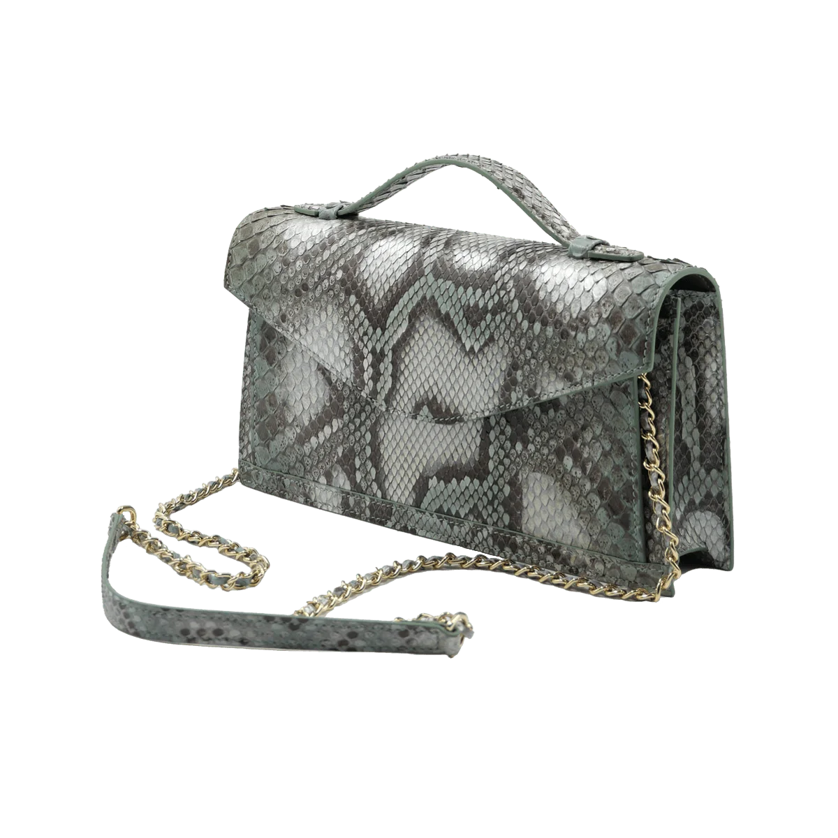 CERVIN WITH HANDEL a luxury clutch bag designed by Bangkok Bootery expert craftsman who are No.1 in Thailand. Cervin with handle is a medium big size exotic clutch bag with chain leather strap designed by Bangkok Bootery and handcrafted from start to finish. Cervin in size 25cm is Bangkok Bootery’s best selling sling bags crafted from genuine python back skin in matte and shiny limited tone of colors. An envelope shape design that looks chic and luxury highlighted by a top handle and flap over.